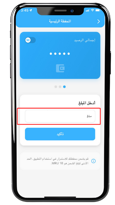3.3 Saisissez le montant (⚠️ le montant minimum de recharge est de 10 MRU), puis appuyez sur "Confirmer".